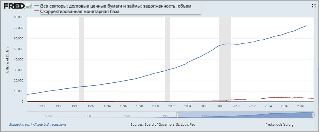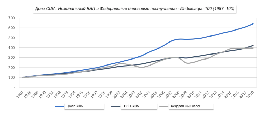 Размер кредитной системы в несколько раз превышает номинальный ВВП. Поскольку кредитная система также на несколько порядков больше базовой денежной массы, экономическая деятельность в значительной степени координируется путем распределения и расширением кредита. Тем не менее, рост кредитной системы значительно опережал рост ВВП в течение последних трех десятилетий. На приведенной ниже диаграмме показана скорость изменения кредитной системы по отношению к скорости изменения номинального ВВП и федеральных налоговых поступлений (с 1987 года по сегодняшний день). В системе ФРС кредитная экспансия определяет номинальный ВВП, который в конечном итоге диктует номинальный уровень поступлений федеральных налогов.