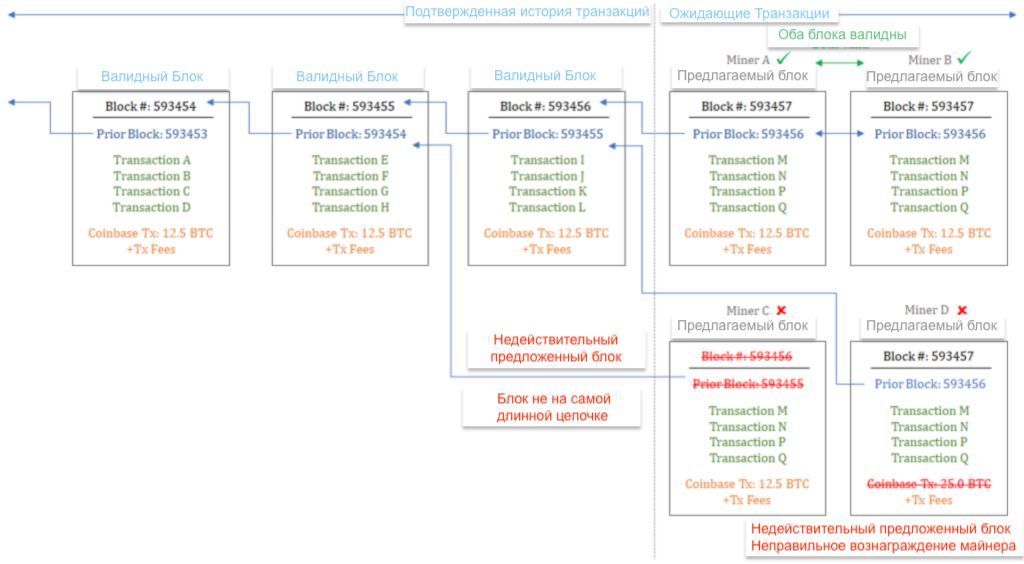 Как часть механизма консенсуса, некоторые ноды (называемые майнерами) выполняют функцию Proof of Work сети Биткоин для добавления новых Биткоин блоков в блокчейн. Эта функция проверяет полную историю транзакций и рассчитывает ожидающие транзакции. В конечном счете, процесс майнинга является основой безопасности Биткоина в физическом мире. Чтобы решить блок, майнеры должны выполнить триллионы криптографических вычислений, которые требуют значительных энергетических ресурсов. Как только блок решен, он предлагается остальной части сети для проверки. Все ноды (включая других майнеров) проверяют, является ли блок действительным. В основе этой проверки лежит общий набор правил консенсуса сети, обсужденных ранее. Если какая-либо транзакция в блоке недействительна, весь блок недействителен. Помимо этого, если предложенный блок не основан на последнем действительном блоке (то есть самой длинной версии цепочки блоков), блок также недействителен.