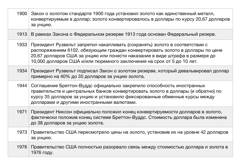 Стоимость доллара не результат свободного рынка. Вместо этого, его стоимость образовалась от того, что он частично представлял золото (и изначально серебро). По сути, доллар был решением внутренних ограничений конвертируемости и транспортабельности золота; его появление зависело от денежных свойств основных металлов, а не от свойств самого доллара. Изначально доллар был системой, основанной на доверии: принимайте доллары и верьте, что в будущем их можно будет обменять на золото по фиксированному курсу. Ограничение золота и его окончательный провал в качестве денег — это заслуга долларовой системы, и если бы не золото, доллар никогда бы не существовал в том виде, в котором он существует сейчас. Для ознакомления с кратким обзором истории доллара и золота, обратите внимание на следующую таблицу: