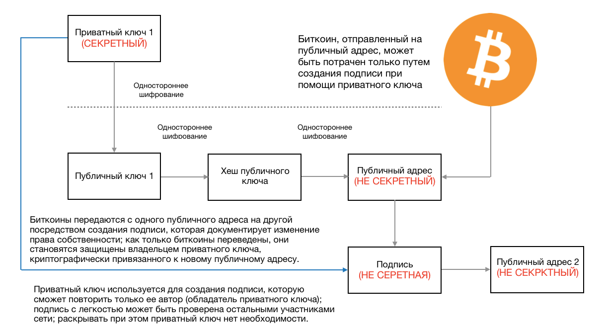 Когда валидная транзакция транслируется в сеть, биткоины расходуются (или переводятся) на определенные публичные Биткоин адреса. Публичные адреса генерируются посредством публичных ключей, которые генерируются посредством приватных ключей. Публичные ключи и публичные адреса могут быть рассчитаны с использованием приватного ключа, но приватный ключ не может быть рассчитан на основе публичного ключа или публичного адреса. Это односторонняя функция, защищенная устойчивым шифрованием. Публичными ключами и адресами можно поделиться, не раскрывая никакой информации о приватных ключах. Когда биткоин отправляют на публичный адрес, он, по сути, блокируется в сейфе. Для того, чтобы потратить этот биткоин, необходимо разблокировать сейф, соответсвенно, должна быть создана валидная подпись с помощью соответствующего приватного ключа (каждый публичный ключ и адрес привязан к уникальному приватному ключу). Владелец приватного ключа предоставляет уникальную подпись, фактически не раскрывая самогó секрета. Остальные участники сети могут проверить валидность подписи, фактически не имея никаких деталей самогó приватного ключа. Пары публичного и приватного ключей являются основой Биткоина. И, в конечном счете, приватные ключи — это то, что контролирует права доступа к экономической ценности сети.