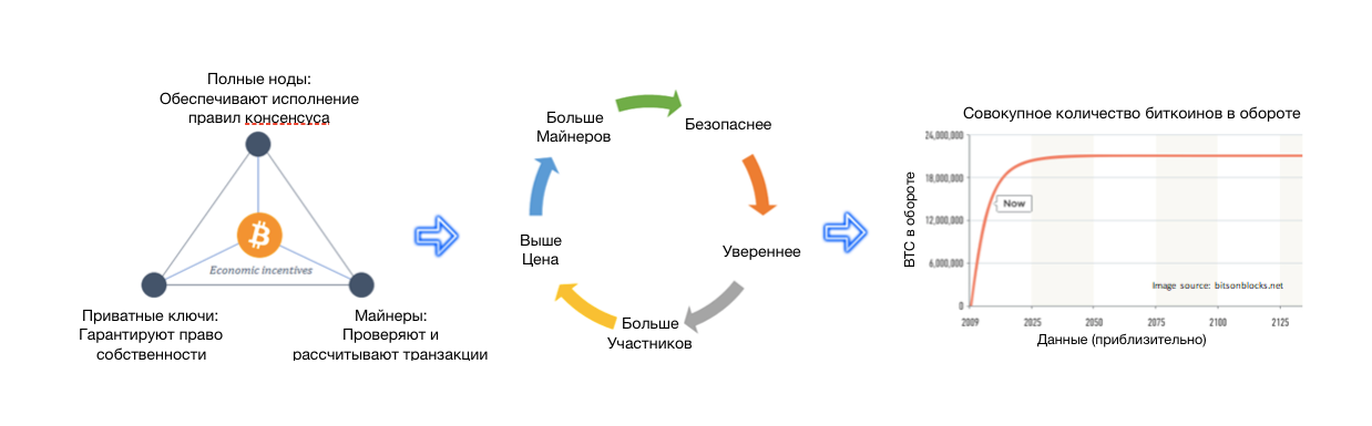 Забудьте все предвзятые представления о том, что такое деньги, и представьте себе валютную систему, которая имеет принудительно ограниченный и фиксированный запас. Кто угодно может подключиться к сети без необходимости чьего-либо разрешения, кто угодно может отправлять транзакции любому участнику сети в любой точке мира; каждый может независимо и легко проверить предложение валюты, а также право собственности в сети. Представьте себе глобальную экономику, в которой миллиарды людей по всему миру могут осуществлять транзакции посредством одной общей децентрализованной сети, и каждый может прийти к единому мнению относительно принадлежности сети без координации какого-либо центрального органа. Насколько ценна эта сеть? Биткоин является ценным, потому что его преложение фиксировано, его предложение фиксировано в силу того, что он ценен. Экономические стимулы и модель управления сетью поддерживают друг друга; кумулятивный эффект — децентрализованная денежная система на не требующей доверия основе с фиксированным предложением, которое доступно глобально и доступно каждому.