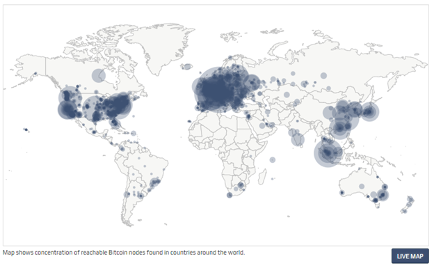 При фиксированном предложении увеличение спроса естественным образом приводит к более равномерному распределению биткоинов между участниками сети. Это ограничивает возможность приобретения биткоинов, и общее количество монет, в конечном итоге, делится на более мелкие порции, принадлежащие все большему числу участников. В результате повышения спроса на Биткоин и роста ценности сети, она становится не только более востребованной, но и более безопасной. Ее значимость растет, так как все большее количество участников используют один и тот же механизм определения ценности через более надежную константу. И, по мере того, как в консенсусе сети появляется все больше участников, вся система становится более устойчивой к коррупции и, в конечном итоге, более защищенной. Обратите внимание, что сам блокчейн не гарантирует фиксированного предложения, и, сам по себе, график эмиссии биткоинов не заслуживает доверия только лишь в силу того, что этого требует программное обеспечение. Вместо этого ограничение в 21 миллион заслуживает доверия потому, что сеть управляется на децентрализованной основе и число ее участников постоянно растет. 21 миллион становится более достоверно фиксированным числом, благодаря все большему количеству участников консенсуса. Это, в конечном итоге, увеличивает надежность константы, поскольку каждый участник со временем контролирует все меньшую долю сети. По мере того, как распространение Биткоина растет, безопасность и значимость сети идут “нога в ногу”. Рассмотрим распределение и относительную плотность распространения Биткоина в мире (см. ниже Тепловую карту узлов сети). С ростом охвата и плотности внутри каждого рынка константа биткоина стабилизируется.