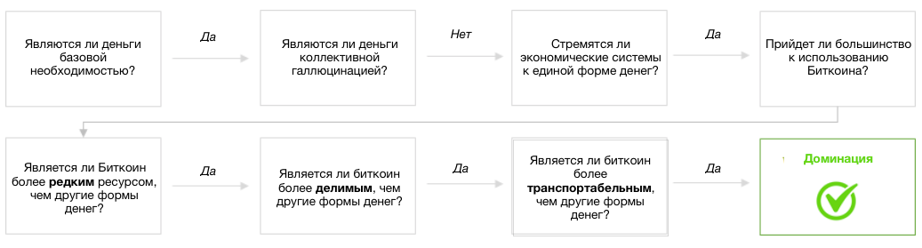 Уверенность в том, что биткоин станет доминирующей мировой валютой может показаться сумасшествием. И, скорее всего, если смотреть на ситуацию “сверху вниз” и основываться на классической Теории вероятности, эта уверенность, и вправду, является сумасшествием. Сегодня биткоин — это одна из тысяч конкурирующих цифровых валют, которые, на первый взгляд, выглядят одинаково. Его покупательная способность в 150 миллиардов долларов -— капля в море по сравнению с глобальной финансовой системой, долг которой приравнивается к 250 триллионам долларов. Покупательная способность одного только золота приравнивается к 8 триллионам долларов (в 50 раз больше Биткоина). Каковы шансы, что 11-летняя интернет-сенсация восстает из пепла финансового кризиса 2008 года и превратится в доминирующую мировую валюту? Сама идея звучит смешно, или, по крайней мере, кажется слишком маловероятной, чтобы даже обратить на себя внимание. Однако, при взгляде “снизу вверх” и основываясь на основополагающих принципах, существование тысяч альтернативных криптовалют отходит на задний план. В совокупности, простоту и ясность тому, что ранее могло показаться слишком сложным для восприятия, придают лишь несколько основополагающих принципов. В случае, когда вам необходимо оценить тысячу возможностей, чтобы прийти к правильному решению, сам процесс может оказаться непрактичным, а достижение результата — невозможным. Но если бы вы могли исключить 999 из этих возможностей, основанных на одном или нескольких исходных принципах, принятие правильного решения стало бы более практичным, а ответ — последовательным.