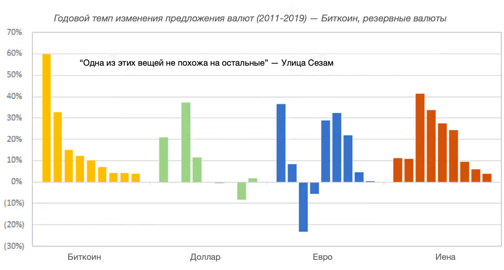 Все формы денег конкурируют друг с другом за право участия в каждом обмене. Если основной (или единственной) полезностью актива является обмен на другие товары и услуги, и если он не претендует на доходы в качестве производительного актива (такого как акции или облигации), он должен быть конкурентоспособным за право выступать в качестве денег. Как следствие, любой актив вступает в эту конкурентную борьбу с биткоином, но никакая другая валюта не обеспечит более надежную константу, чем биткоин, который уже существует и является исчисляемо редким. Редкость биткоинов будет постоянно усиливаться как со стороны предложения, так и со стороны спроса. При этом для всех других валют будет действовать противоположная сила вследствие рефлексивного характера денежной конкуренции. Различие между двумя денежными товарами никогда не бывает маргинальным и не является следствием индивидуальных решений об обмене в определенной среде. Деньги — это интерсубъективная проблема, и выбор в пользу одного денежного средства является непосредственным отказом от другого, что, в свою очередь, приводит к тому, что одна сеть приобретает ценность (и полезность) за счет других. Поскольку биткоин становится более редким и более надежным в качестве константы, другие валюты становятся менее редкими и менее стабильными. Денежная конкуренция является игрой с нулевой суммой, а относительная редкость — динамическая функция как спроса, так и предложения — выступает в роли фундаментального различия между двумя денежными средами, которое со временем только усиливается и становится более очевидным.
