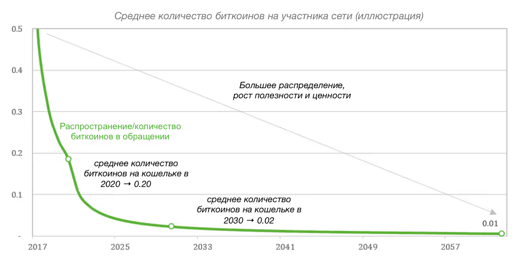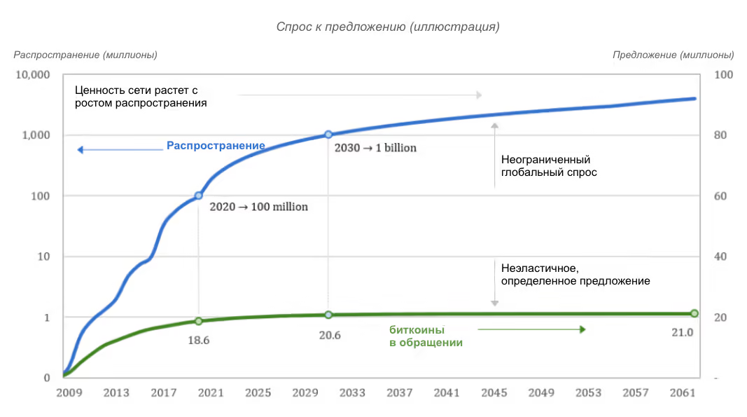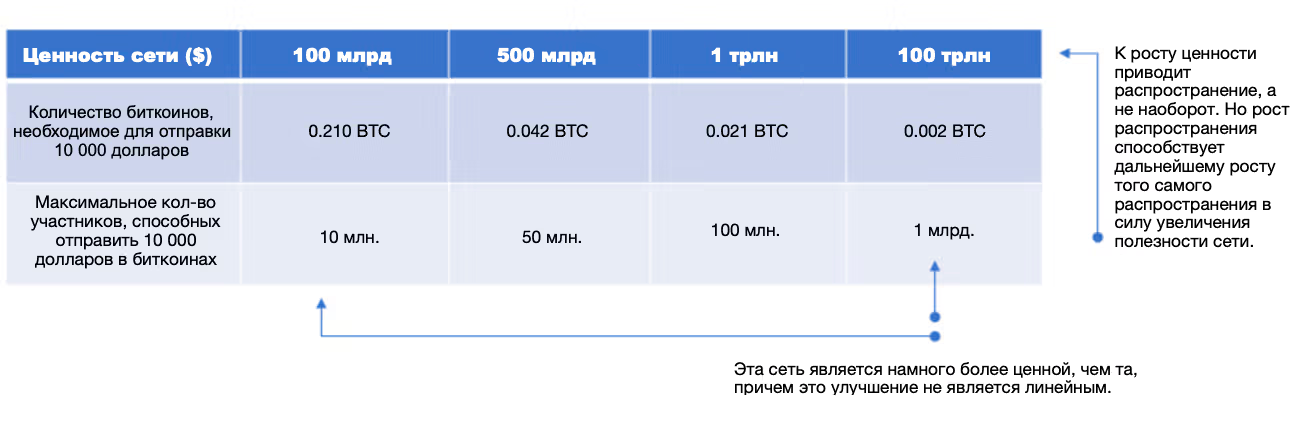 Обладание биткоинами становится ценой участия в потенциально самой большой и самой развернутой экономике в истории человечества. Биткоин является глобальным и доступен на основе, не требующей доверия. Поскольку биткоин становится общим языком для всех участников экономических отношений, любой, кто является частью сети, сможет общаться и, в конечном итоге торговать с другими ее участниками. Чем больше торговых партнеров, тем выше ценность, предоставляемая участникам каждой отдельной единицей. Хотя в той или иной юрисдикции, скорее всего, всегда будут возникать трения, препятствующие торговле, доступ к одной и той же единой валюте устраняет сам источник трения при передаче информации о ценности, а фиксированная эмиссия биткоинов позволит его ценовому механизму накапливать и передавать более совершенную информацию с наименьшим искажением по сравнению с любой другой формой денег. И по мере того, как все больше желающих предпочитают хранить ценность в биткоинах, постоянство его предложения становится более достоверным, а механизм ценообразования — более надежным и точным. Новые пользователи денежной сети вносят свой вклад и осознают ценность как функцию распространения, поэтому невозможно опоздать с покупкой биткоина, и биткоин никогда не будет слишком дорогим.