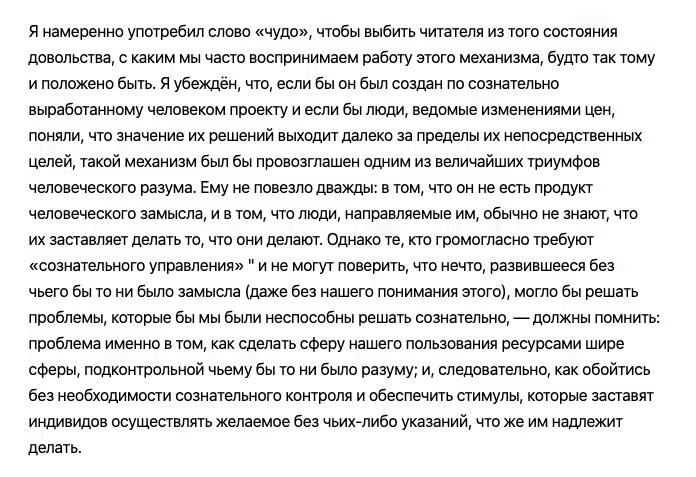 Без использования единой валюты не было бы понятия цены. А в отсутствие концепции цены невозможно осуществление каких-либо экономических расчетов. Возможность выполнения экономических расчетов позволяет принимать самостоятельные решения. Участник, заинтересованный в торговле, использует информацию, передаваемую системой цен, с целью удовлетворить потребности других участников, получив при этом и собственную выгоду. Фактически, структура спроса и предложения формируется посредством системы цен, и, в конечном итоге, система цен является необходимостью, поскольку она обеспечивает передачу информации, без которой удовлетворение основных потребностей было бы невозможным. Представьте, что ничего из того, что вы потребляете, не имеет различимой цены. Как определить, что произвести, чтобы получить необходимые товары? А теперь признайте, что ваше собственное представление о ценности производимых вами товаров и услуг, как и товаров и услуг, производимых другими, не будет доступно без существования цен. Это — замкнутый круг, но деньги — это товар, который позволяет основополагающим структурам экономики формироваться посредством системы цен. Деньги могут считаться величайшим непреднамеренным изобретением в истории человечества несмотря на то, что часто являются «корнем зла». И такое изобретение не могло появиться в условиях сознательного контроля.