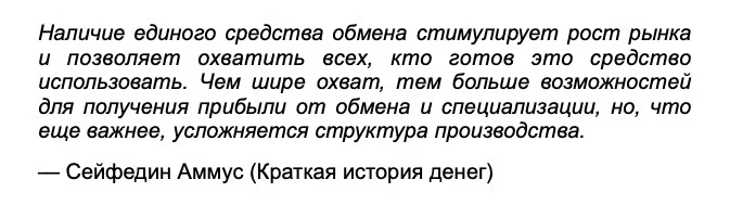 С практической точки зрения, все тяготеют к единому денежному благу, с помощью которого можно выразить ценность, потому что это решение — в их индивидуальных и коллективных интересах. Проблема заключается в том, чтобы интерпретировать ценность другим участникам рынка. Если бы консенсус не был сформирован, сам процесс был бы контрпродуктивным. Но именно свойства самого денежного блага обеспечивают конвергенцию и консенсус. Воображаемый мир с тысячами валют слеп к этим фундаментальным первым принципам. Критическая масса людей, пришедшая к общей переменной, оперирует входными данными, необходимыми для получения действительно значимой информации. И ценность выбранной денежной системы растет, так как все больше участников используют ее в качестве инструмента для обмена товарами и услугами. Фундаментальная причина заключается в том, что чем больше участников используют единую денежную среду, тем больше информации она накапливает и тем полезнее становится.