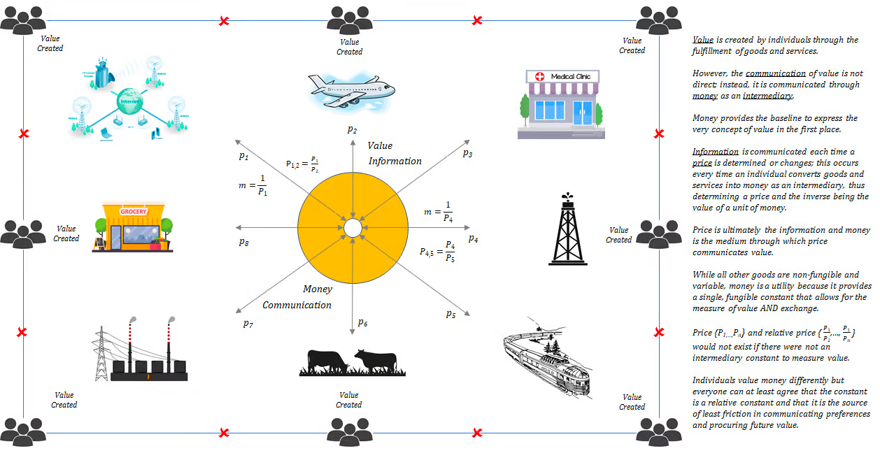 И это также не является случайностью. Одни не столь осведомленные участники считают, что деньги являются коллективной галлюцинацией, в то время, как по мнению других, ценность денег закономерно определяется правительством. На самом же деле, деньги — это инструмент, изобретенный человеком для удовлетворения специфической потребности рынка в организации торговли. Деньги помогают облегчить эту деятельность, выступая в качестве посредника между серией настоящих и будущих обменов. Без какого-либо осознанного контроля или управления участники рынка оценивают различные товары и сходятся на инструменте со свойствами, наиболее подходящими для облегчения самой явной цели преобразования текущей ценности в будущую. Принимая во внимание, что индивидуальные потребительские предпочтения варьируются от индивида к индивиду и постоянно меняются, потребность в обмене является, практически, универсальной, а функция — однородной. Деньги позволяют каждому в будущем воспроизводить ценность, произведенную в настоящем. Ценности у всех разные (как говорится: «Сколько людей, столько и мнений»), и они имеют обыкновение со временем меняться. Неизменна необходимость в потреблении и передаче информации о собственных предпочтениях, и она распространяется на всех участников на интерсубъективной основе.