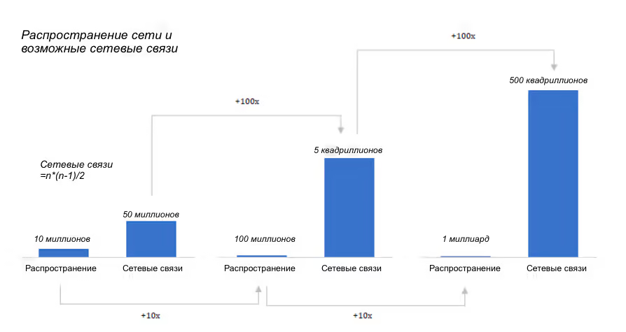 Поскольку принятие денежной сети растет в порядковом соотношении (в 10 раз), возможные сетевые подключения увеличиваются на два порядка (в 100 раз). Помимо демонстрации взаимной выгоды от распространения и принятия определенной денежной сети, становятся очевидными последствия перенаправления ценности денежную сеть меньшего размера. Сеть, составляющая одну десятую размера, обладает 1% от числа потенциальных связей. Хотя не все сети одинаково распределены, бóльшая денежная сеть подразумевает более надежную константу для передачи информации — бóльшую плотность, более актуальную информацию и, в конечном итоге, более широкий выбор. Размер денежной сети и ожидаемый рост этой сети становятся критическими компонентами межсубъективного А/B теста, когда каждый человек определяет, в какой среде ему функционировать. Несмотря на то, что число участников, с которыми возможно поддерживать социальные отношения, по сути, ограничено, у денежных сетей таких ограничений нет. Именно деньги позволяют вырваться из ограничений числа Данбара. Денежно-кредитная сеть позволяет миллионам (если не сотням миллионов) незнакомых людей вносить вклад в конечные продукты, произведенные участниками сети. При этом требуется относительно небольшое количество прямых соединений.