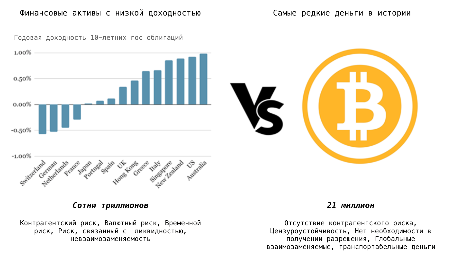 По существу, с течением времени и по мере распространения знаний, все больше отдельных лиц предпочтет простоту Биткоина (и его фиксированное предложение в 21 млн. монет) сложным финансовым вложениям и структурированным финансовым рискам. Финансовые активы несут операционный риск и риск контрагента, в то время как биткоин является легко делимым и передаваемым активом на предъявителя с фиксированным предложением. Полезность денег принципиально отличается от полезности финансового актива. Финансовый актив предоставляет возможность получения дохода от продуктивного актива, выраженного в определенной форме денег. Владелец финансового актива рискует с целью заработать больше денег в будущем. Хранение денег является ничем иным, как просто хранением денег; они ценны своей способностью быть обменянным на товары и услуги в будущем. Проще говоря, за деньги можно купить продукты и услуги; любимые акции, облигации или казначейские бумаги этого не могут, и на то есть причины.