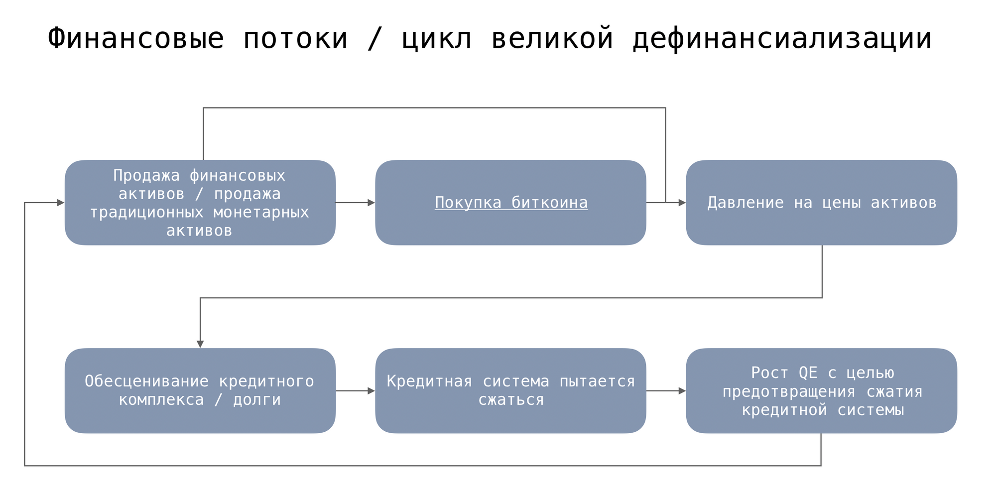 Трансформация может начаться с наиболее очевидно завышенных в плане цены финансовых активов, таких как суверенный долг с отрицательной доходностью, но затронуты будут все активы. По мере перетока ценности в биткоин, остальные активы подвергнутся понижательному давлению, что аналогичным образом создаст понижательное давление на стоимость долговых инструментов, поддерживаемых этими активами. Спрос на кредиты будет в целом снижаться, что приведет к тому, что кредитная система в целом будет сокращаться (или пытаться сокращаться). Это, в свою очередь, ускорит потребность в количественном смягчении (увеличении базовой денежной массы) для поддержания кредитных рынков, что еще больше ускорит переход от финансовых активов к биткоину. Процесс дефинансиализации будет подпитываться и ускоряться за счет обратной связи между стоимостью финансовых активов, кредитной системой и количественным смягчением.