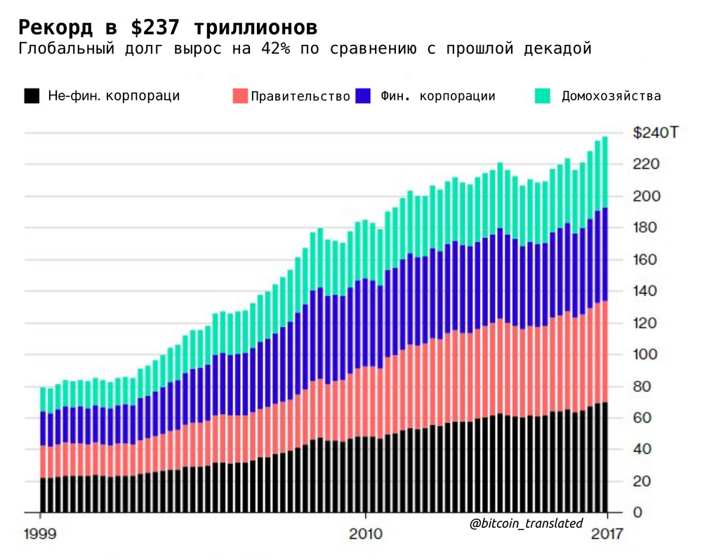 Основным стимулом для сохранения биткоинов является то, что они представляют собой незыблемое право бессрочно владеть фиксированным процентом всех денег мира. Нет центрального банка, который мог бы произвольно увеличить предложение валюты и обесценить сбережения. Запрограммировав набор правил, которые ни один участник не может изменить, Биткоин станет катализатором, который вызовет тенденцию к обратной «финансиализации». Степень «финансиализации» экономики во всем мире является прямым результатом нарушенных монетарных стимулов, и Биткоин вновь вводит надлежащие стимулы для поддержания сбережений. Говоря более прямо, девальвация денежных сбережений является основным драйвером «финансиализации», точка. Когда динамика, породившая это явление, будет скорректирована, обратный набор операций будет естественным образом восстанавливаться.Если девальвация вызвала «финансиализацию», то логично, что возврат к здравому денежному стандарту будет иметь обратный эффект. Прилив «финансиализации» уже на подходе, однако, он только начинает формироваться, так как большинство еще не осознает очевидных нам вещей. В течение десятилетий общепринятым здравым смыслом считалось инвестирование подавляющего большинства всех сбережений, и подобное мышление не может измениться в одночасье. Но по мере того, как мир узнает о Биткоине, в то же время, как глобальные центральные банки печатают триллионы долларов, и аномалии вроде 17 триллионов долларов отрицательного долга, приносящего доход, продолжают иметь место, картина будет становиться все яснее.