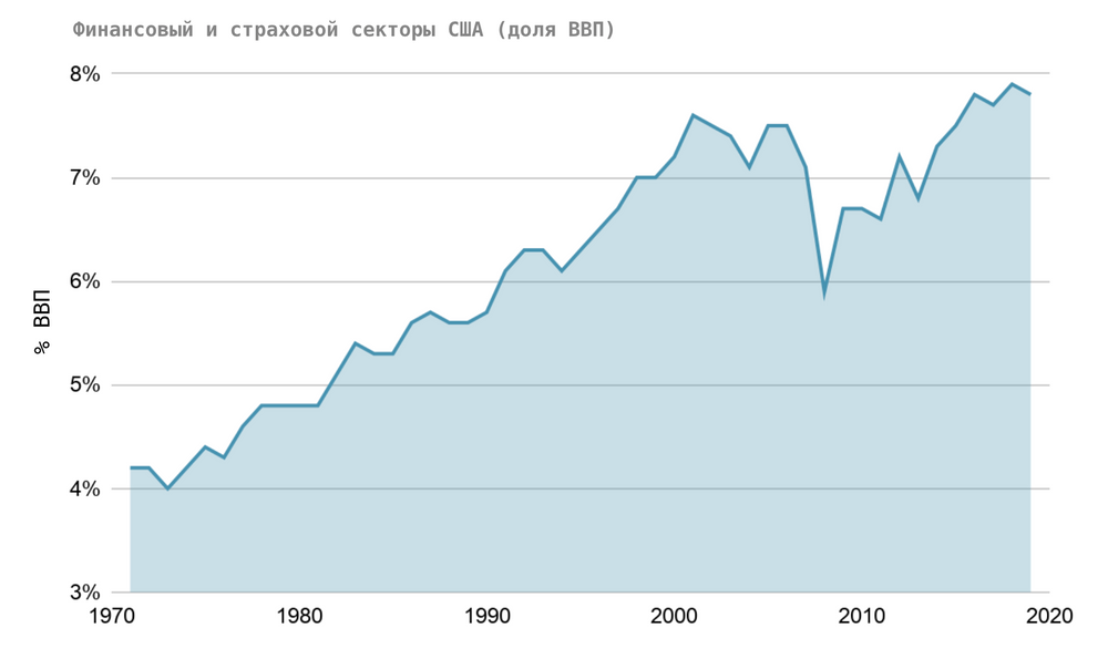 Финансовый сектор захватил бóльшую часть экономики с течением времени, потому что в мире, где деньги постоянно обесцениваются, существует больший спрос на финансовые услуги. Акции, корпоративные облигации, казначейские облигации, суверенные облигации, паевые инвестиционные фонды, долевые ETF, облигации ETF, листинговые ETF, тройные листинговые ETF, дробные акции, ипотечные ценные бумаги, CDO, CLO, CDS, CDX, синтетические CDS/CDX и др. Все эти продукты олицетворяют собой «финансиализацию» экономики, и они становятся более актуальными (и востребованными) с нарушением денежной функции.