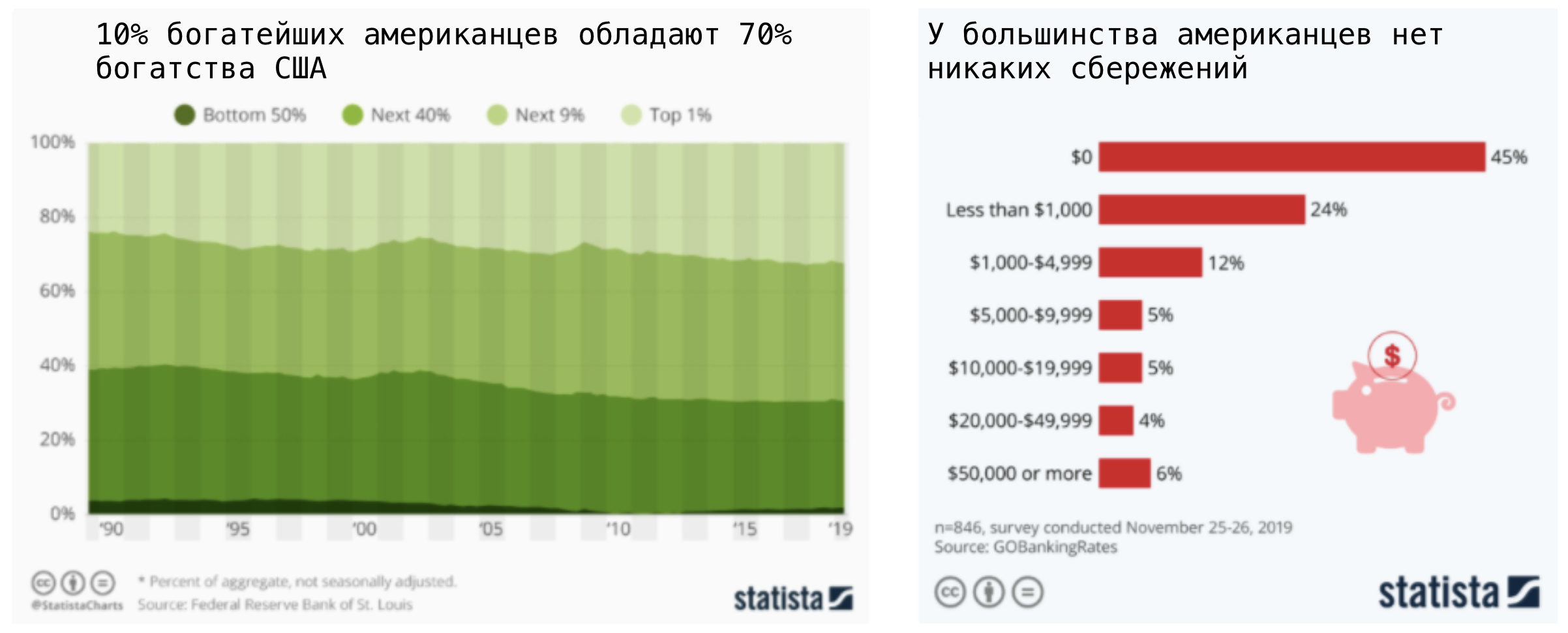 Это мир, которого опасаются кейнсианские экономисты, полагая, что инвестирование не будет иметь места, если существует стимул к сбережениям. Искаженная теория гласит: если людей стимулировать к «накоплению» денег, то никто никогда не будет тратить деньги, а инвестиции, считающиеся «необходимыми», не будут сделаны. Если никто не будет тратить деньги, а рискованные инвестиции не будут сделаны, то вырастет безработица! Это — экономическая теория, преподаваемая в современных аудиториях; несмотря на страхи кейнсианцев, в мире, в котором стимулируются сбережения, люди не перестанут идти на риск.Мало того, качество инвестиций на самом деле вырастет, так как и потребление, и инвестиции выигрывают от неискаженных ценовых сигналов, учитывая что альтернативная ценность денег более точно оценивается свободным рынком. Когда все решения, касающиеся расходов, оцениваются в сравнении с ожиданиями потенциально бóльшей (а не меньшей) покупательной способности в будущем, инвестиции будут направляться на наиболее продуктивную деятельность, а повседневное потребление будет подвергаться более тщательной фильтрации.И наоборот, когда на точку принятия решения об инвестировании сильно влияет нежелание хранить доллары, результатом становится «финансиализация». Аналогичным образом, когда потребительские предпочтения определяются ожиданием того, что деньги потеряют свою ценность, а не обретут ее, целью инвестирования становится удовлетворение этих искаженных предпочтений. В конечном счете, краткосрочные стимулы побеждают долгосрочные; приближенные к правительственной верхушке индивиды оказываются в выигрышном положении по сравнению с новыми игроками, а экономика находится в состоянии стагнации, что все сильнее подпитывает финансиализацию, централизацию и финансовую инженерию вместо продуктивных инвестиций. Это причина и следствие: преднамеренное поведение с непреднамеренными, но предсказуемыми последствиями.Заставьте деньги потерять свою ценность, и люди станут поступать глупо, потому что поступать глупо становится более рациональным, а иногда даже поощряется. Люди, которые в противном случае предпочли бы сохранить накопленную ценность, вынуждены идти на дополнительный риск, потому что их сбережения теряют в цене. В этом мире сбережения финансиализируются. И когда вы создаете стимул не экономить, не удивляйтесь, просыпаясь в мире, в котором очень малая часть людей обладает хоть какими-то сбережениями. Именно на это указывают эмпирические данные, и, несмотря на то, насколько поразительным это может оказаться для профессора экономики, отсутствие сбережений, вызванное сдерживающим фактором, очень предсказуемо является одним из основных источников хрупкости финансовой системы.