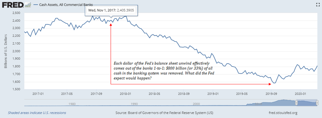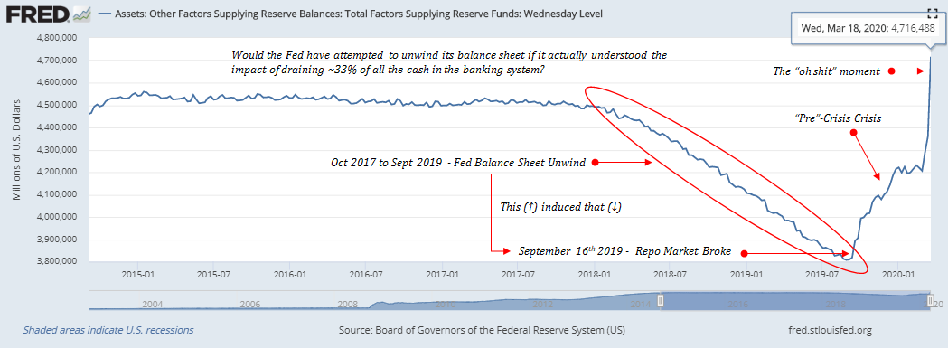 Будьте уверены, полтора триллиона долларов, поставляемые на рынки репо, будут конвертированы и приведут к увеличению официальной программы количественного смягчения ФРС, и по консервативным оценкам, в итоге, вся неколичественная программа превысит 4 триллиона долларов. Федеральная резервная система не может потушить огонь в виде кризиса ликвидности, используя краткосрочное финансирование, и у нее не будет другого выбора, кроме как монетизировать бóльшую долю кредитной системы, (что уже имело место быть в 2008 году, а на этот раз проблема гораздо серьезнее). Кроме того, Конгресс работает над первоначальным пакетом стимулов в размере двух триллионов долларов в ответ на глобальную пандемию. В условиях, когда рынок уже переживает кризис ликвидности, банковская система волшебным образом не располагает этими денежными средствами для финансирования масштабного расширения дефицита федерального правительства. В конце концов, кризис ликвидности разворачивается. В результате ФРС будет вынуждена финансировать любые фискальные меры в рамках постоянно расширяющейся программы количественного смягчения. Это единственный способ для банков получить деньги, необходимые для финансирования такого рода фискальных стимулов. Все дороги ведут к ФРС и бесконечному QE.