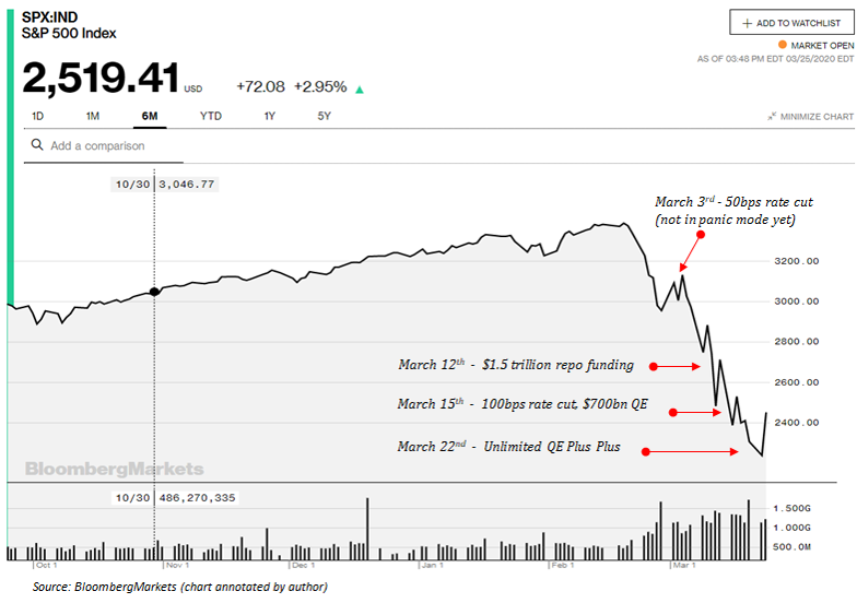 Еще до резкого торможения экономики (из-за раздутой правительством паники) ФРС уже предоставила ~ 500 миллиардов долларов в виде срочного финансирования рынков репо. Теперь масло льется прямо в огонь. Но тревожит не только масштаб; это явная демонстрация потери контроля в результате следования извилистым путем инкрементализма. После первого обвала фондового рынка, ФРС сообщила об экстренном снижении процентной ставки на 50 базисных пунктов. Рынок еще немного просел, и тогда ФРС объявила о дополнительном краткосрочном финансировании в размере 1,5 трлн долларов (1–3 месяца) для рынков репо. Рынок снова просел, и через три дня была объявлена официальная программа количественного смягчения (QE) на 700 миллиардов долларов для прямой покупки государственных облигаций США на 500 миллиардов долларов и ипотечных ценных бумаг на 200 миллиардов долларов. Одновременно с этим движением краткосрочные ставки были снижены на 100 б.п. (вплоть до нуля).