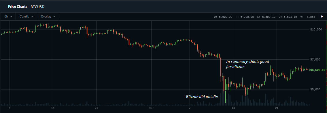 Обещанием Биткоина является более стабильная валютная система. Нет никаких обещаний по поводу того, какой будет его цена в определенный момент времени; единственное заверение, которое он дает, состоит в том, что его предложение не подлежит манипулированию или систематическому обесцениванию со стороны центральных банков (или кого-либо еще). Один из, казалось бы, вечных вопросов звучит следующим образом: “Является ли биткоин защитным активом?”, а в последнее время — и вопрос о корреляции биткоина с традиционными (разрушающимися) финансовыми рынками. Простая истина заключается в том, что биткоин не является “тихой гаванью”. Он не достаточно широко распространен, чтобы стать убежищем для ваших средств. Он до сих пор находится на стадии зарождения, и вполне предсказуемо, что в начале глобального сокращения объема заемных средств, такой ликвидный актив, как биткоин, подвергнется продажам, так же, как и все остальные.