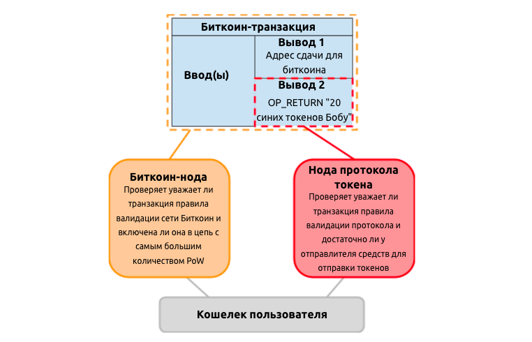 Первые протоколы эмиссии токенов в Биткоине, такие как Counterparty и OmniLayer, работали путем размещения метаданных внутри транзакции, чтобы “окрасить” (отсюда “окрашенные монеты” или colored coins) ее и сигнализировать, что ее следует рассматривать как передачу токенов. Такая сигнализация обычно происходит в выводе OP_RETURN, который, конечно, игнорируется обычными узлами Bitcoin, но может быть интерпретирован узлами, знающими протокол токенов, которые будут применять свои правила проверки транзакций с токенами.