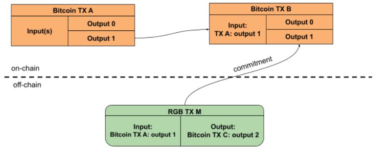 Если у вас есть токены, назначенные на выход 1 Биткоин-транзакции A, для их перемещения вам нужно создать транзакцию RGB и транзакцию Биткоин-расходов с TX A: выход 1, фиксирующую транзакцию RGB. Как вы видите, транзакция RGB перемещает токены с Bitcoin TX A: выход 1 на Bitcoin TX C: выход 2 (который не показан на этой диаграмме), а не на какой-либо выход Bitcoin TX B. В большинстве случаев мы можем ожидать, что выходы TX B просто изменят адреса, чтобы отправить сатоши, принадлежащие расходуемому UTXO, обратно владельцу за вычетом комиссии, одновременно зафиксировав транзакцию RGB, чтобы избежать возможности двойной траты.