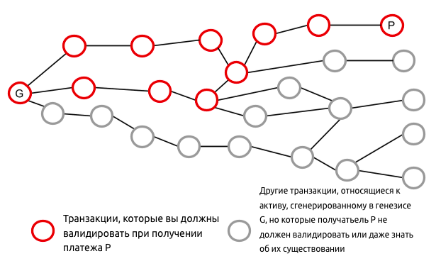 Такая конструкция способствует масштабируемости, поскольку вам не нужно подтверждать всю историю актива, а только те транзакции, которые имеют к вам отношение. Кроме того, тот факт, что транзакции не транслируются в блокчейн, повышает конфиденциальность, поскольку меньше людей знают о существовании вашей транзакции.