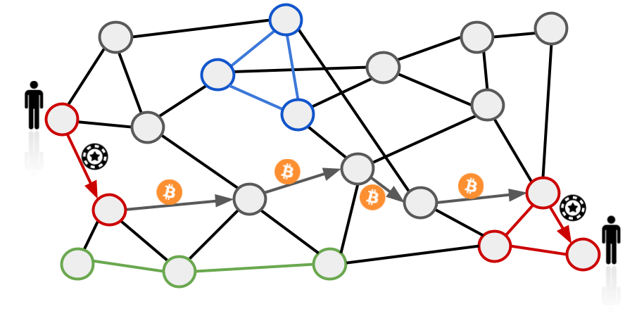 Графическое представление возможной сети Lightning Network с цветными каналами RGB. Серые круги представляют обычные узлы LN, а цветные круги - узлы, поддерживающие определенный актив RGB. При передаче актива по пути Lightning будут некоторые узлы, имеющие как цветные, так и обычные каналы биткоина, которые будут действовать как обменные пункты, позволяя платежу дойти до места назначения, используя ликвидность биткоина.
