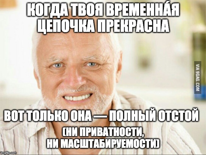 Более того, использование временнóй цепочки подразумевает, что каждая нода должна постоянно следить за всеми изменениями в сети. Каждый пользователь системы на протяжении всего времени (и даже в далеком будущем) должен загружать и проверять каждую отдельную транзакцию в цепочке. Такую систему, явно, нельзя назвать масштабируемой. В данном случае это отразится и на секретности, поскольку все участники вынуждены хранить копии всех транзакций в сети. Это повышает вероятность деанонимизации пользователей и криминалистического анализа блокчейна.