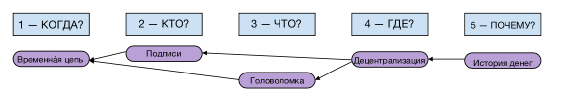 Одна из проблем при попытке объяснить Биткоин как явление — его цель, его структуру и то, как первое обусловливает второе — это решить, с чего начать. Позвольте мне утомить вас историей из личного опыта, которая поможет мне оправдать свой выбор. В 2014 году, когда я стоял перед выбором концептуального плана, я остановился на знаменитой практике пяти основных вопросов, так называемой общепринятой технике структурирования информации, которая, как утверждает Википедия, тянется своими корнями к самому Аристотелю!