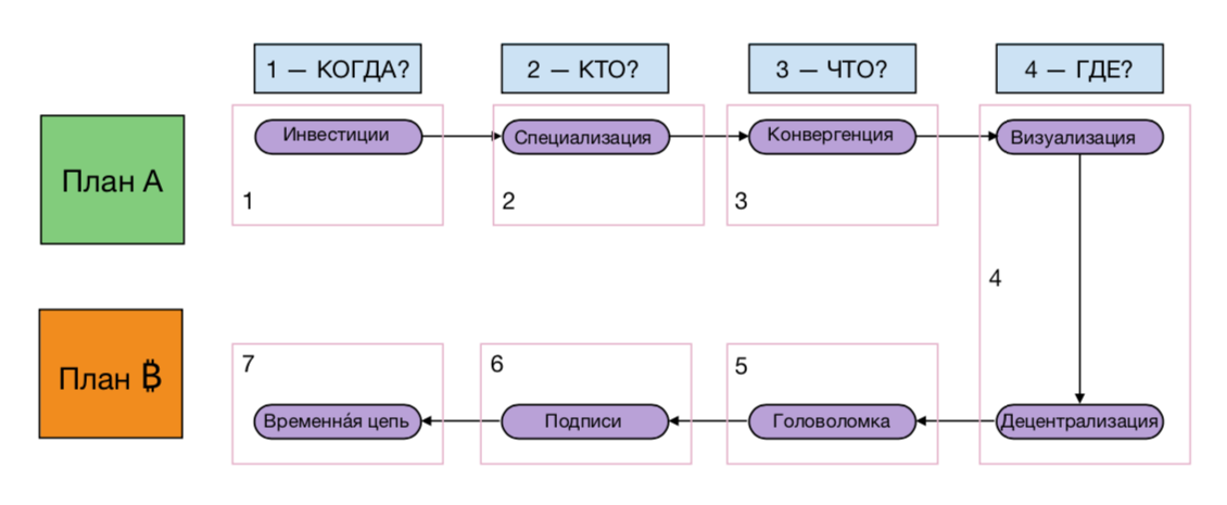 Вторая часть называется “План ₿” (да, как вы уже догадались: “₿” означает Биткоин): Все начинается с неприятной ситуации, в которой мы по вине Плана А оказались на пути к гениальному открытию Биткоина. Часть “Где?” - это мост (и переломный момент) между двумя моделями. Нечто подобное: