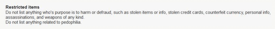 Товары, запрещённые к продаже на Silk Road: Всё, чья цель заключается в нанесении вреда или обмане, например, краденные предметы или информация, краденные кредитные карты, фальшивые деньги, персональные данные, заказные убийства и оружие любого рода. Всё, связанное с педофилией.