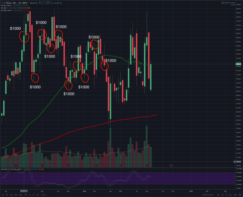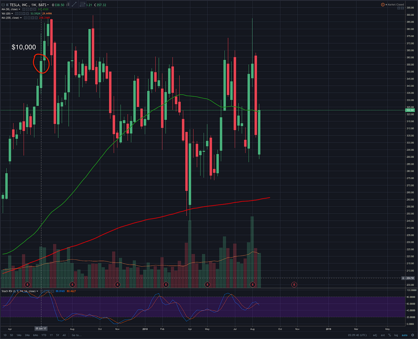 Давайте возьмем в качестве примера акции компании Tesla. Большой потенциал, много волатильности на данный момент. TSLA: NYSE?