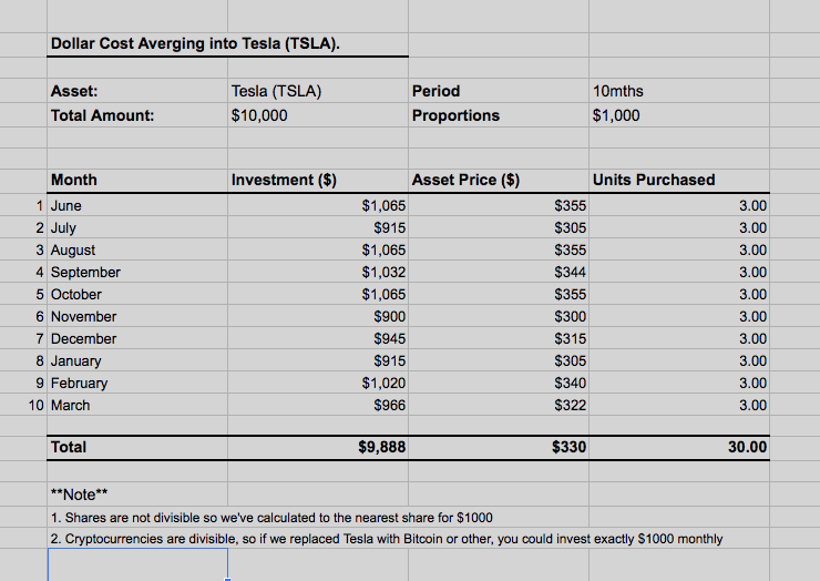 Вы просто ставите перед собой цель купить актива на $1000 в месяц (или 3 акции в месяц), и волатильность сглаживается.