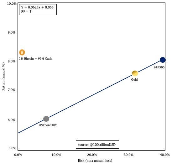 Биткоин буквально не умещается на графике со своей доходностью в 200% и риском в 80%. Так как я не могу разместить Биткоин на графике, я изменил позицию до 1% в биткоинах и 99% в валюте. Этот подход к инвестированию в Биткоин занял место на графике гораздо выше линии, на которой расположились традиционные активы: 8% доходности, 1% риска (обратите внимание, что вы не можете потерять больше 1%, даже если Биткоин упадет на 99%, потому что вы вкладываете только 1%). Поэтому моя первая мысль звучала так: “Рынок видит риски, которые отсутствуют во входных данных”. Вот список некоторых возможных рисков: