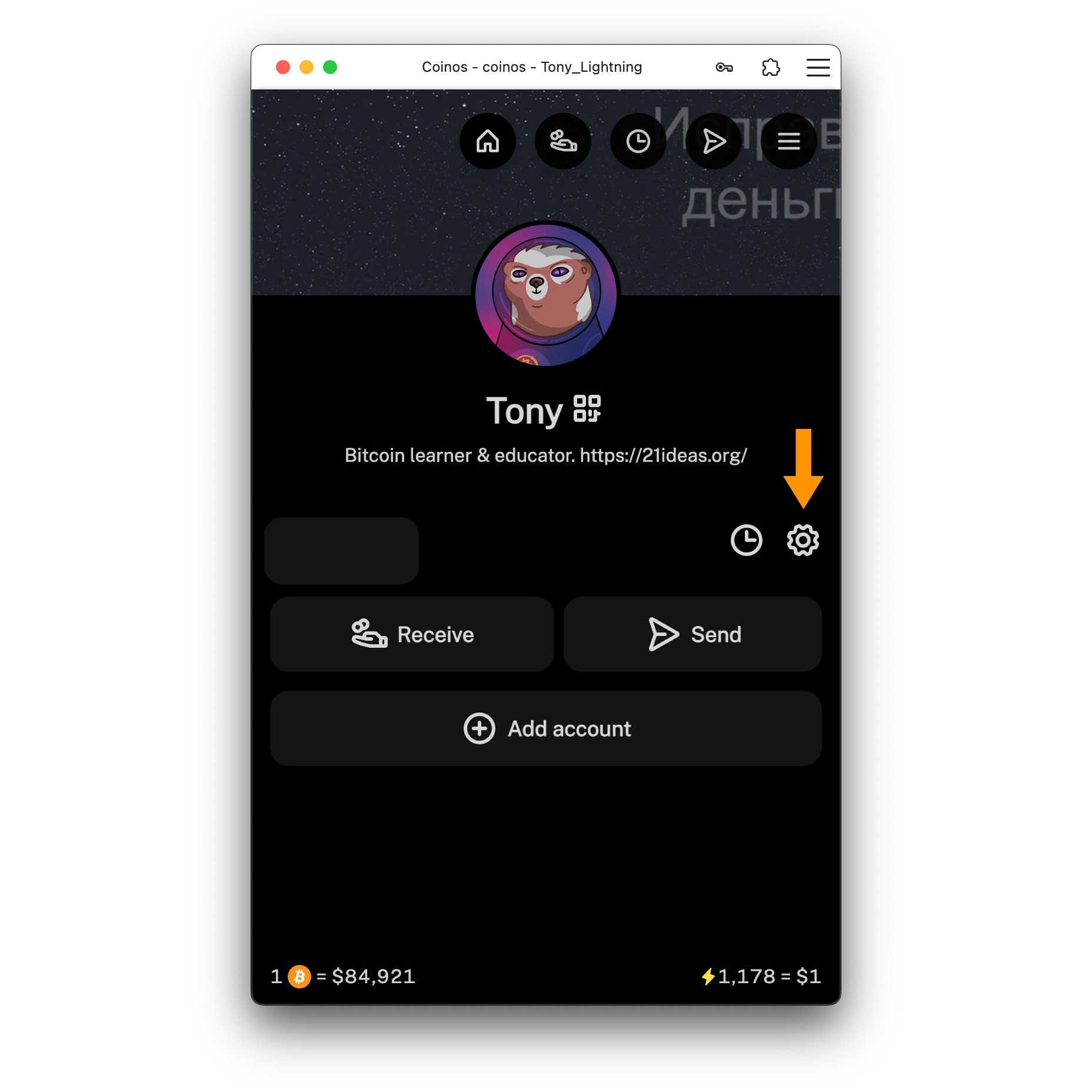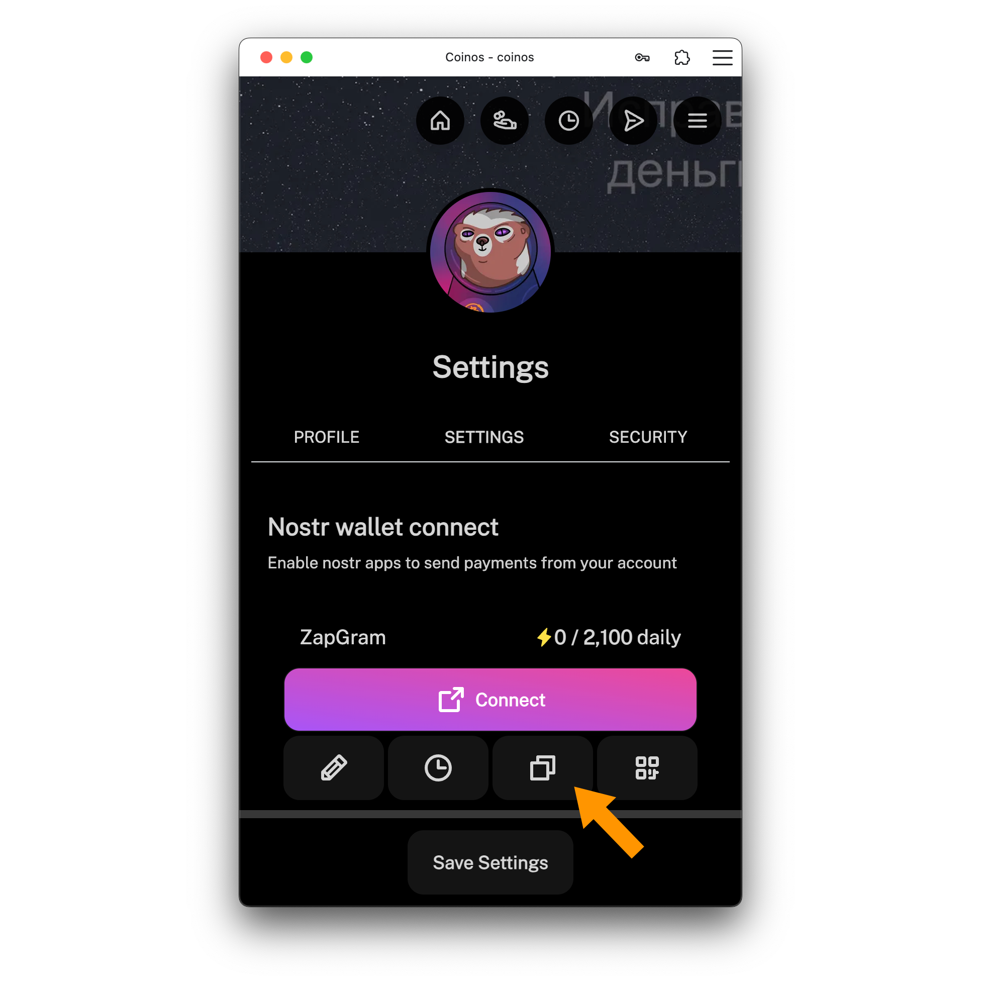 Чтобы привязать свой кошелёк Coinos к ZapGram: