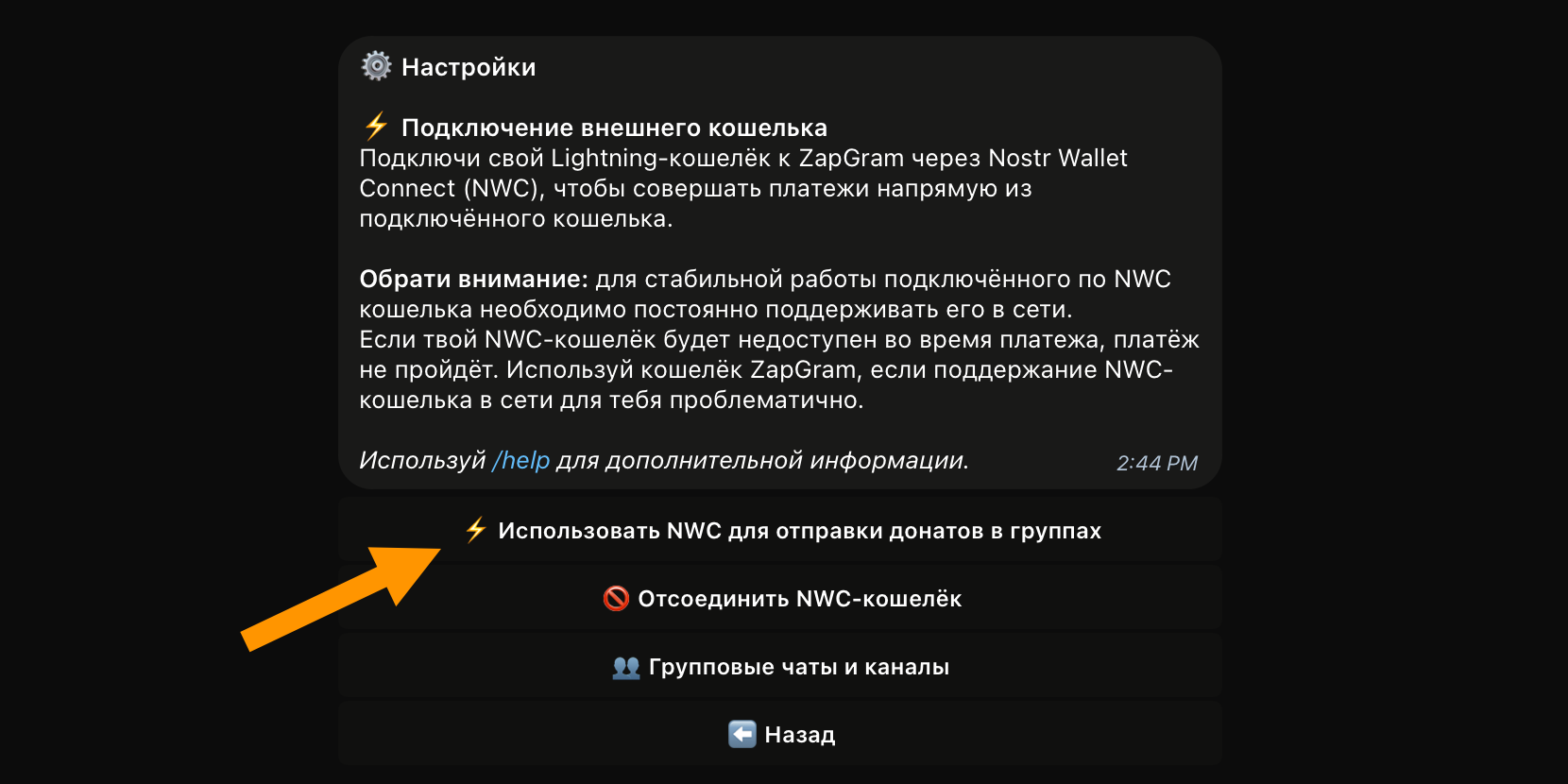 Готово 🎉! Вы можете пользоваться Телеграм-ботом ZapGram некастодиальным образом. Просто выберите Использовать NWC для отправки донатов в группах в настройках бота: