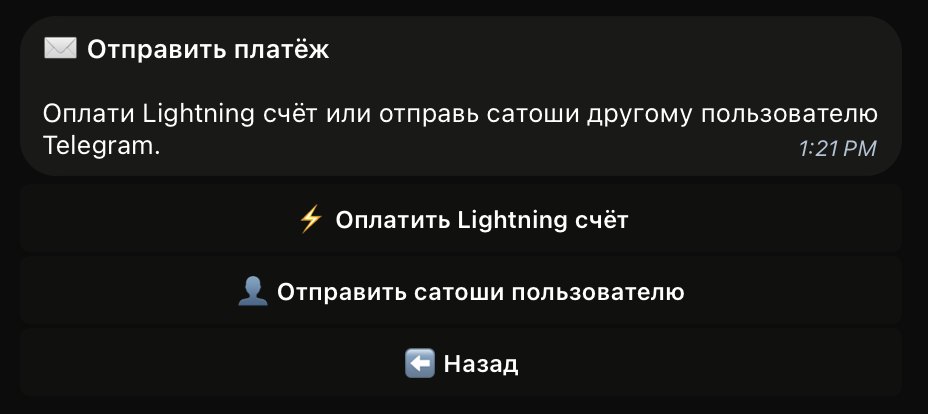 ⚡️ Оплатить Lightning счётдля отправки средств на сторонний кошелёк (по лайтнинг-инвойсу).👤 Отправить сатоши пользователюдля отправки средств пользователю Телеграм.
